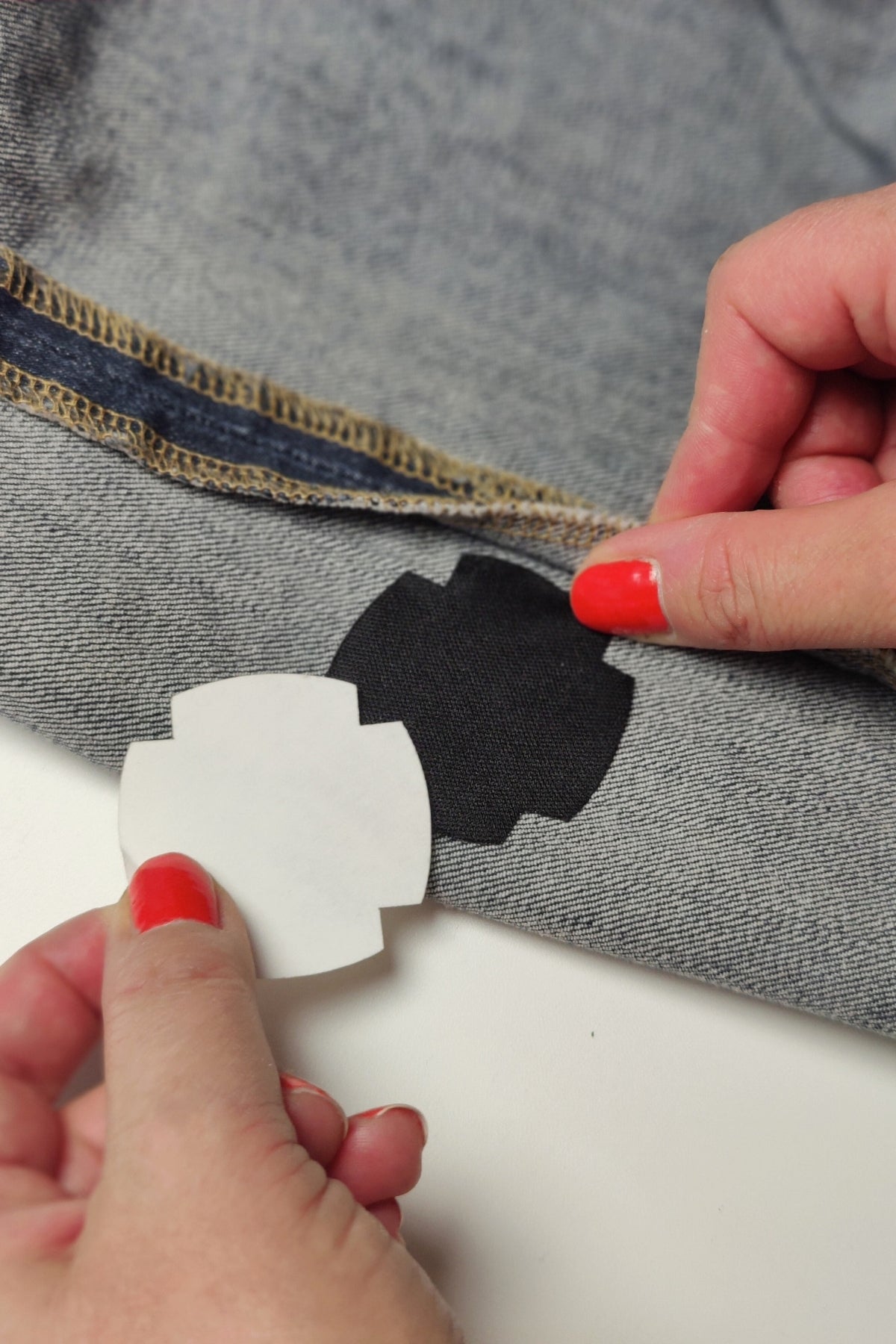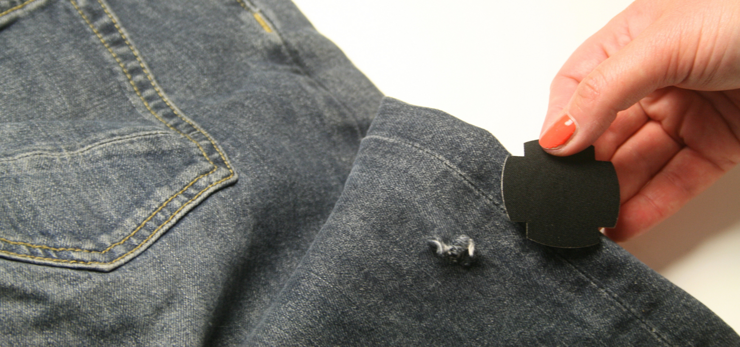 Tips 1. Om du är ett fan av diskreta reparationer, lappa dina jeans från avigsidan: kläm ihop hålet, placera FabPatch™- lappen på avigsidan och vid behov, klipp av trådarna från höger sida med en sax.